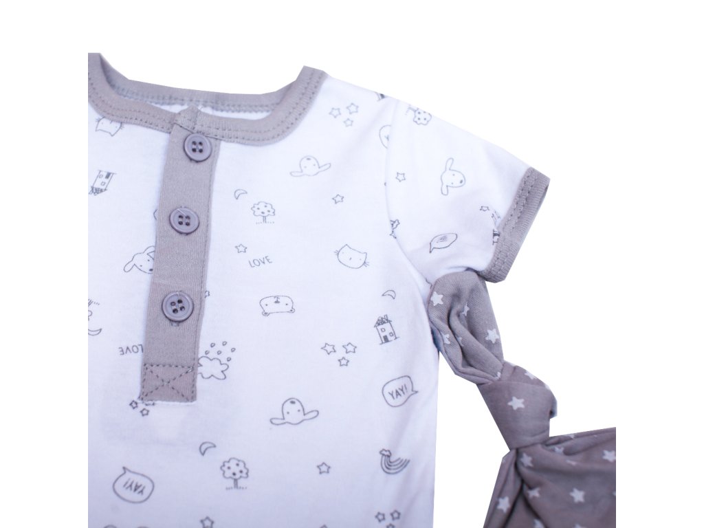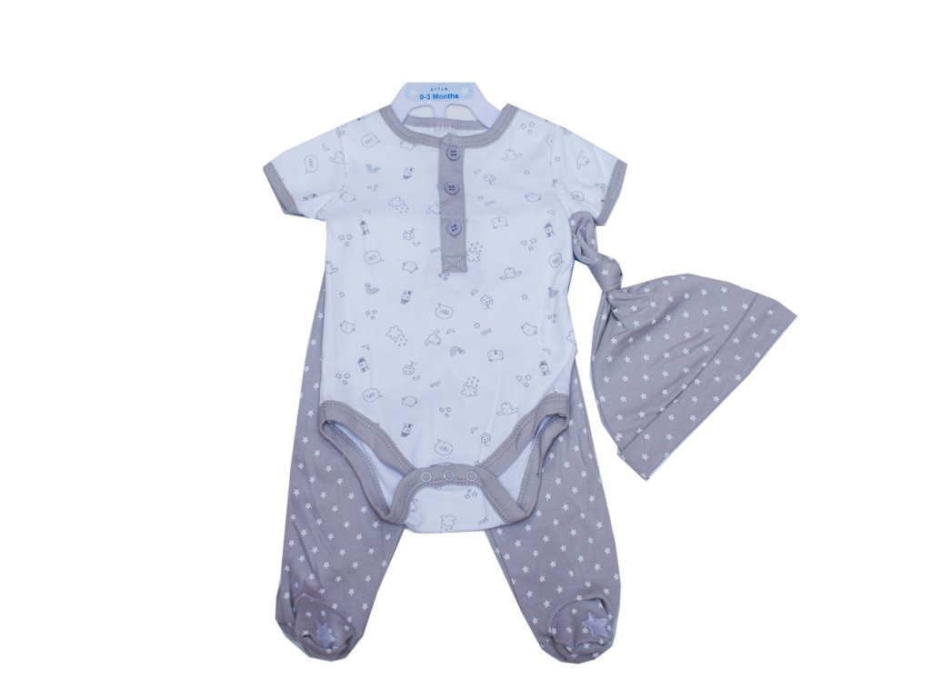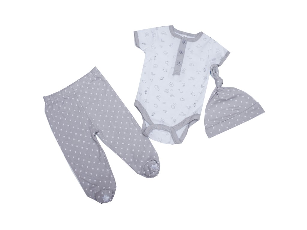 Krásný třídílný kojenecký komplet: Kojenecké body, tepláky s capáčky, čepička.