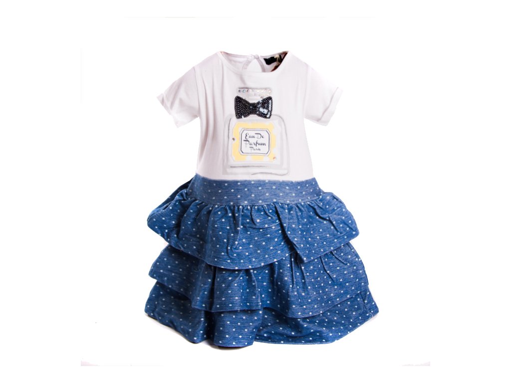 Šaty modrá silná sukně volánky bílé tričko s motýlkem
